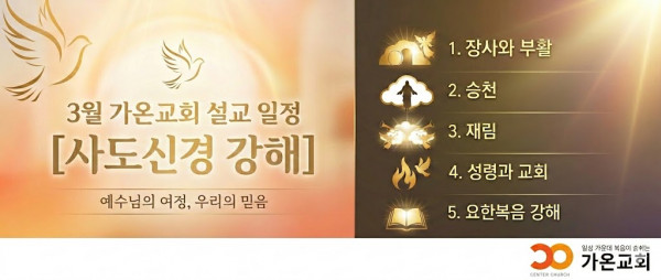 이전글 다음글 목록 페이지 정보 가온교회 작성일2026-02-28 19:53:18 조회91회 댓글0건 기간20260228-20260331 관련링크 26년 3월 설교일정 본문 사도신경 강해 댓글목록 등록된 댓글이 없습니다. 이전글 다음글 목록