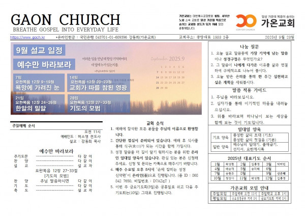 이전글 다음글 목록 페이지 정보 가온교회 작성일2025-10-04 11:53:39 조회81회 댓글0건 관련링크 25년 9월 28일 교회소식 본문 주님을 예배합니다. 댓글목록 등록된 댓글이 없습니다. 이전글 다음글 목록