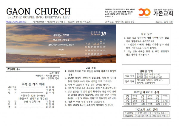 이전글 다음글 목록 페이지 정보 가온교회 작성일2025-10-04 11:54:10 조회90회 댓글0건 관련링크 25년 10월 5일 교회소식 본문 온가족 예배 댓글목록 등록된 댓글이 없습니다. 이전글 다음글 목록