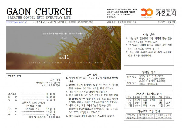 이전글 다음글 목록 페이지 정보 가온교회 작성일2025-11-14 22:01:07 조회99회 댓글0건 관련링크 25년 11월 2일 교회소식 본문 주님께 더 가까이 나아갑니다. 댓글목록 등록된 댓글이 없습니다. 이전글 다음글 목록