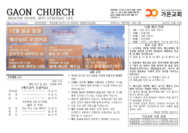 다음글 목록 페이지 정보 가온교회 작성일2025-12-13 19:32:26 조회53회 댓글0건 관련링크 25년 12월 14일 교회소식 본문 주님을 찬양합니다. 댓글목록 등록된 댓글이 없습니다. 다음글 목록